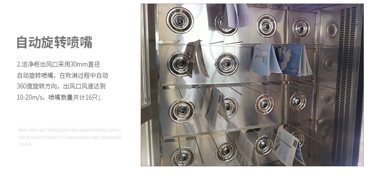 采用靜電中和的電級處理方式,使空氣經過G45效率的初效過濾器、H14效率的高效過濾器處理,將空氣經過加壓后,通過360度自動旋轉噴嘴,風向呈渦輪狀吹出,潔凈靜電風將檔案表面的浮塵吹落,其風速大小可調,可根據檔案的實際需求選擇風速,同時檔案除塵柜內部有嵌入式紫外線殺菌燈,能夠自動定時開啟和關閉,對室內進行殺菌。在對檔案進行除塵、消毒后再進行保存從而能夠更加有效、長久的保存檔案文獻資料。